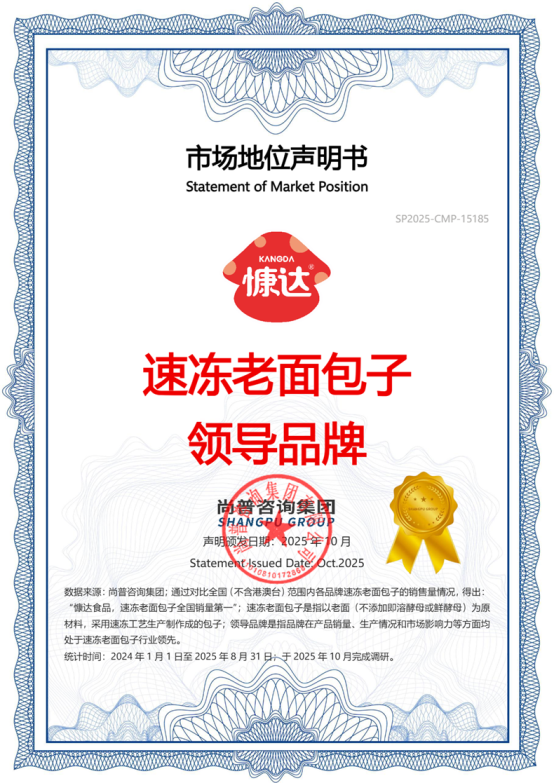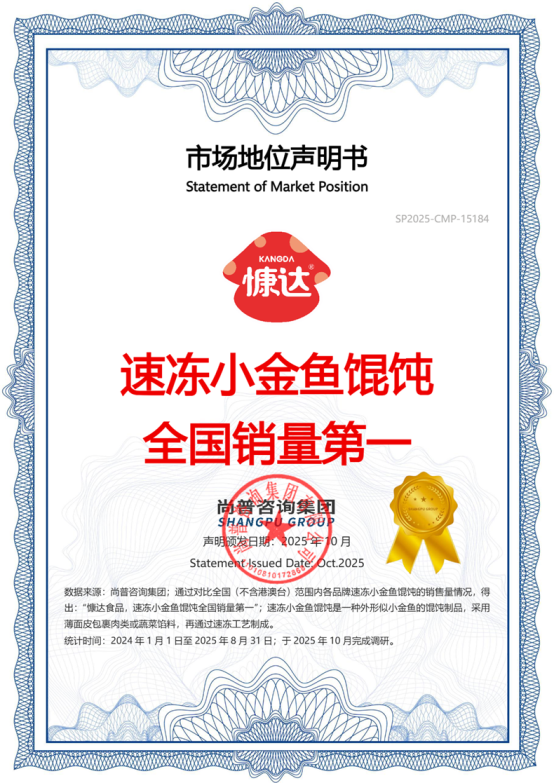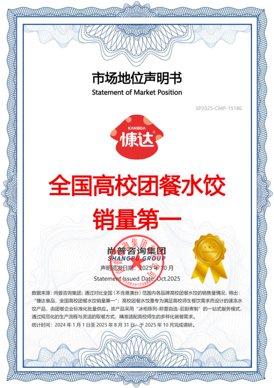 2025年10月,尚普咨询集团向濮阳市慷达食品有限公司(以下简称:慷达食品)颁发【慷达食品,速冻小金鱼馄饨全国销量第一】、【慷达食品,速冻老面包子领导品牌】和【慷达食品,全国高校团餐水饺销量第一】市场地位声明书。此次慷达食品荣获尚普咨询集团颁发的市场地位声明书,不仅是对慷达食品产品品质、口味创新与市场口碑的充分肯定,更是对其在速冻面点细分品类及高校团餐场景领先地位的高度认可。慷达食品能够取得如此佳绩,是以市场需求为导向,通过工艺革新、供应链优化及精准营销策略构建核心竞争力的结果。