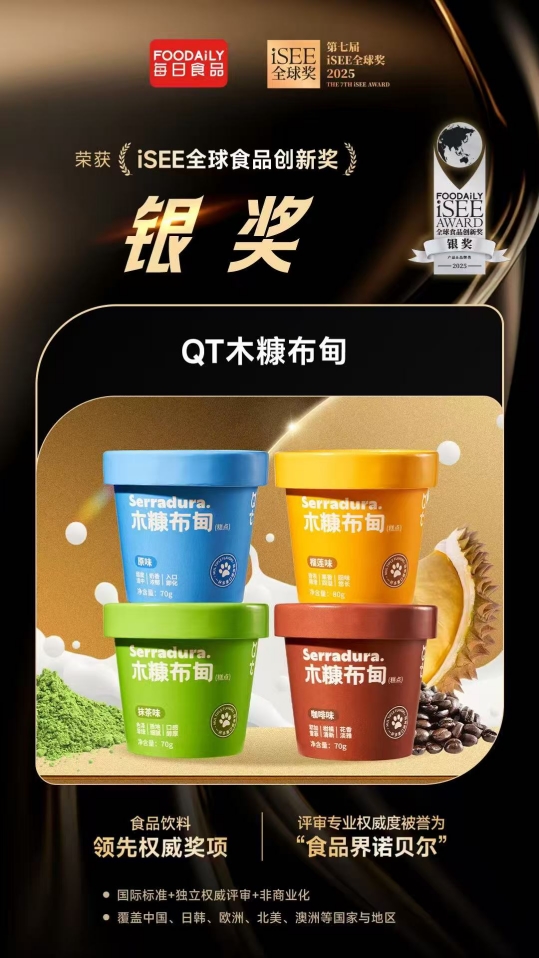 作为新式健康甜品革新者,QT木糠布甸不仅在节目中收获好评,更在业界获得权威认可。在近期揭晓的第七届iSEE全球奖评选中,QT木糠布甸从全球众多竞争者中脱颖而出,斩获被誉为“食品界诺贝尔”的“iSEE全球食品创新奖”银奖,同时榴莲味斩获“iSEE全球美味奖”三星认证,原味、抹茶、咖啡味获“iSEE全球美味奖”二星认证。