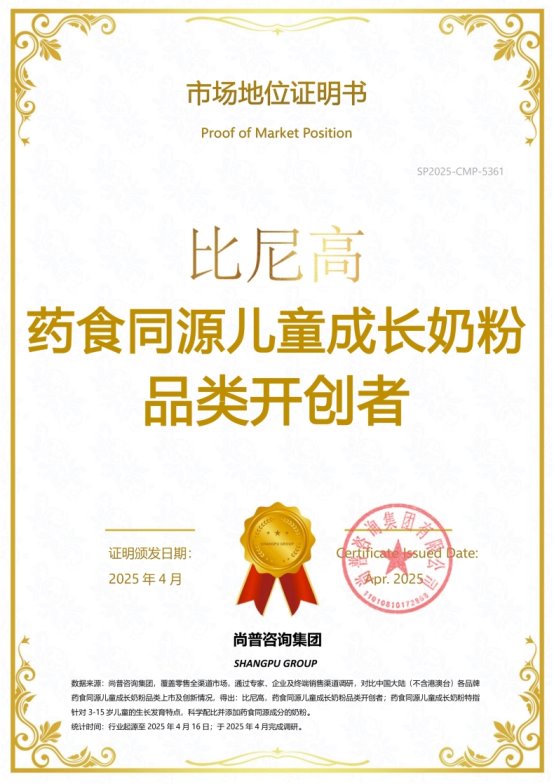 2025年4月,尚普咨询集团向湖南比尼高品牌管理有限公司(以下简称“比尼高”)旗下药食同源儿童成长奶粉颁发市场地位证书。此次比尼高荣获尚普咨询集团【比尼高,药食同源儿童成长奶粉品类开创者】证书,表明比尼高凭借其卓越的创新能力和优良的品质,赢得了市场的广泛认可。