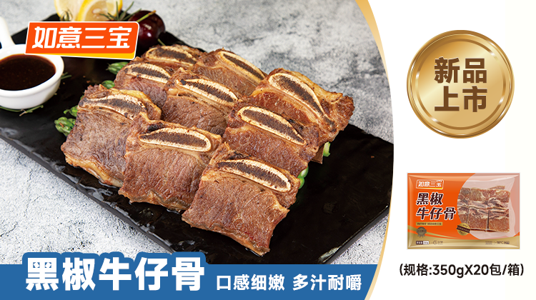 同样属于王牌产品牛仔骨系列延展而来的“规整干切版”黑椒牛仔骨,也是如意三宝的匠心之作。该款黑椒牛仔骨每包12片,片片规整,采用开窗式包装设计,规则大气眼见为实!精选优质黑胡椒,精细研磨调理入味,黑椒风味浓郁,而且入口弹牙有嚼劲,口感与味道都十分诱人。