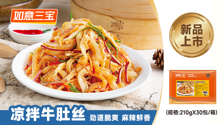 近年来,凉菜类产品在餐饮市场的表现持续升温,而凉拌牛肚丝是如意三宝在凉菜领域的一大诚意之作。如意三宝精选纤维坚韧,口感脆爽Q弹的优质牛肚丝,通过先进设备精细切割条状均匀,并且配备经典川式麻辣红油料包。产品使用时,只需将其完全解冻,并搭配喜欢的辅料,最后淋上配备的红油料包搅拌均匀即可,品尝起来麻辣鲜香够过瘾。