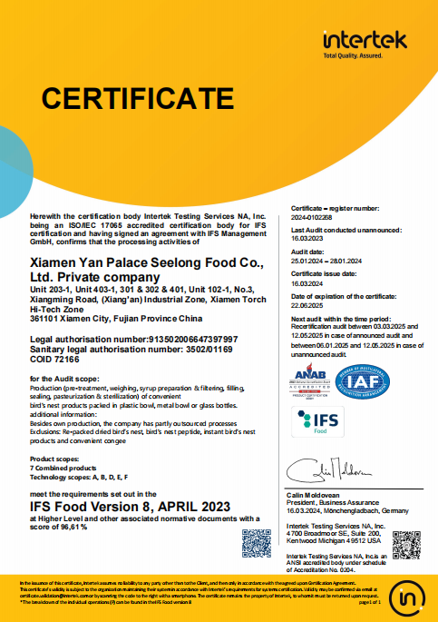 图:燕之屋获得BRC食品安全全球标准、IFS国际食品标准认证
