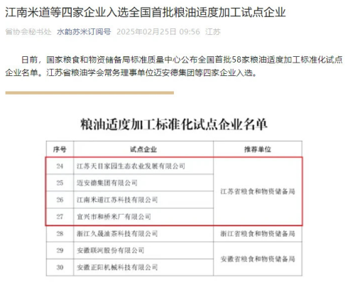 日前,国家粮食和物资储备局标准质量中心公布全国首批58家粮油适度加工标准化试点企业名单,江南米道江苏科技有限公司实力入选。
