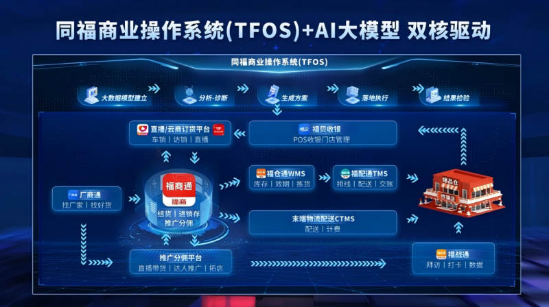 同福共享平台兼具高科技、高效能、高质量特征,与新质生产力高度契合,创造性融合线上线下两种消费场景、实体与互联网两种商业模式,将厂商、经销商、终端商、消费者等多方聚合在同一数智化平台,通过自主研发的七大科技产品,实现产业链各环节信息共享与全方位赋能,走出了具有同福特色的商业模式破局之路。